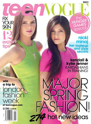Media is in our everyday lives we read it, see it, hear it, watch it and asorb it! Most teenage girls around the world are influenced by what the media say's and does. Magazines main focus is advertising certain products, teenage magazines are basically to do with fashion and beauty that has lots of images of pretty girls to make the teenagers want to purchase the products. This popular magazine cover of Teen Vogue characterizes a typical representations of teenage girls! On this cover are sister's Kendall and Kylie Jenner who are step sisters to the "famous reality tv socialites" the Kardashians. These girls come from a very wealthy family and have many thing's that most girl's only dream of having. They are both skinny and pretty with staight shiny hair have perfect skin and are both wearing minimal makeup. They have the "natural beauty look." The question is how much of what they look like is real and are they really this perfect? Having images like this on teen magazine covers can make teenage girl's have more doubts about their "body image", Teenage girls like to follow the trends represented on the Magazine Covers. But the truth is that it is unrealistic to think you should look like Kendall and Kylie. The cover will be be heavily photoshoped to make Kendall and Kylie look like the dream image for TeenVogue! Because of images like this it can cause low self esteem for normal teenage girls because they keep wanting to look like something thats "fake" this can cause thing's like self body harm, peer presure, bullyng, no confidence and suicide. On the cover of TeenVogue the writing is about fashion, expert tips for skin and makeup ideas this is basically summing up you need all of these things to be happy and look good. Throughout the entire magazine there are images of skinny clear skinned girls that are all smiling and look full of life. Most teen magazines have very few images of dark skinned girls which can lead to multicultural racism; as white skinned girls are usually on the cover and this makes them seem more superior. This is not the only magazine that has "fake" images almost every other teenage girl magazines have the exact same approach to advertising the wrong ideas.